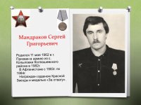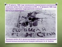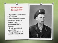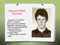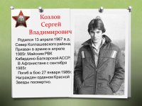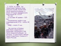 В неимоверно трудных условиях боевой жизни, вдали от дома, ежечасно подвергаясь опасности, и подчас смертельной, они сохранили верность военной присяге, воинскому и человеческому долгу. Многие не вернулись с той войны. Наша святая обязанность - хранить память о них, как о верных сынах Отчизны.