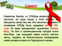 Международным символом борьбы со СПИДом является "красная ленточка" – кусок шелковой ленты, сложенный особым образом. Эту эмблему создал в апреле 1991 года американский художник Франк Мур, который умер от СПИДа в 2002 году в возрасте 48 лет. Ни одно мероприятие в области СПИДа сейчас не обходится без "красной ленточки", которую используют как логотип и ВОЗ, и агентства ООН, и различные благотворительные фонды.