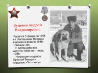 Вед. 2. Спасибо за службу Тимуру Орунову; Эдуарду Полякову; Петру Прозорову и другим проходившим службу в Таджикистане и Чечне.