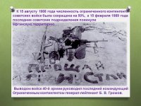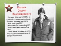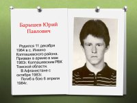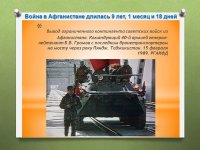 В неимоверно трудных условиях боевой жизни, вдали от дома, ежечасно подвергаясь опасности, и подчас смертельной, они сохранили верность военной присяге, воинскому и человеческому долгу. Многие не вернулись с той войны. Наша святая обязанность - хранить память о них, как о верных сынах Отчизны.