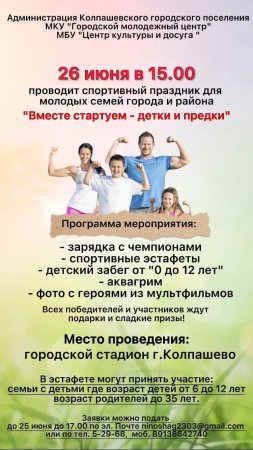 "Вместе стартуем - детки и предки" Опубликовал: Roman, 9-06-2022, 16:30, Информация, 775, 0 Всех жителей города и района приглашаем принять участие всей семьей! Поделиться 0 0