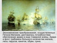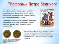 Петр I провел преобразование во многих сферах жизни. Так, военная реформа касалась сбора денег для содержания армии, флота. Петру удалось создать очень мощную регулярную армию и военно-морской флот, каких ранее не было в России. Дальнейшие реформы Петра I ускорили технико- экономическое развитие России. Он провел церковную реформу, финансовую, денежную, преобразования в промышленности, культуре, торговле. В образовании также им были проведены ряд реформ, направленные на массовое просвещение: открыто множество школ для детей и первая в России гимназия(1705). В 1704 году Петром была проведена денежная реформа, в результате которой основной денежной единицей стала не деньга, а копейка. Насильственное бритьё бород.