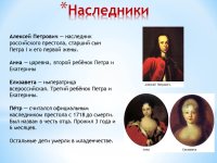 Алексей Петрович наследник российского престола, старший сын Петра I и его первой жены. Анна царевна, второй ребёнок Петра и Екатерины Елизавета императрица всероссийская. Третий ребёнок Петра и Екатерины. Пётр считался официальным наследником престола с 1718 до смерти. Был назван в честь отца. Прожил 3 года и 6 месяцев. Остальные дети умерли в младенчестве. Алексей Петрович. Анна Елизавета