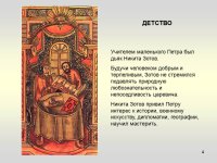 С пятилетнего возраста маленького Петра начали обучать азбуке. Уроки ему давал дьяк Никита Моисеевич Зотов. Главный предмет преподавания, кроме грамоты, заключался в чтении и учении Часослова, Псалтыря и Евангелия. Однако образование будущий царь получил слабое и не отличался грамотностью. Недостатки базового образования Пётр смог впоследствии скомпенсировать богатыми практическими занятиями. Никита Моисеевич Зотов обучает Петра I